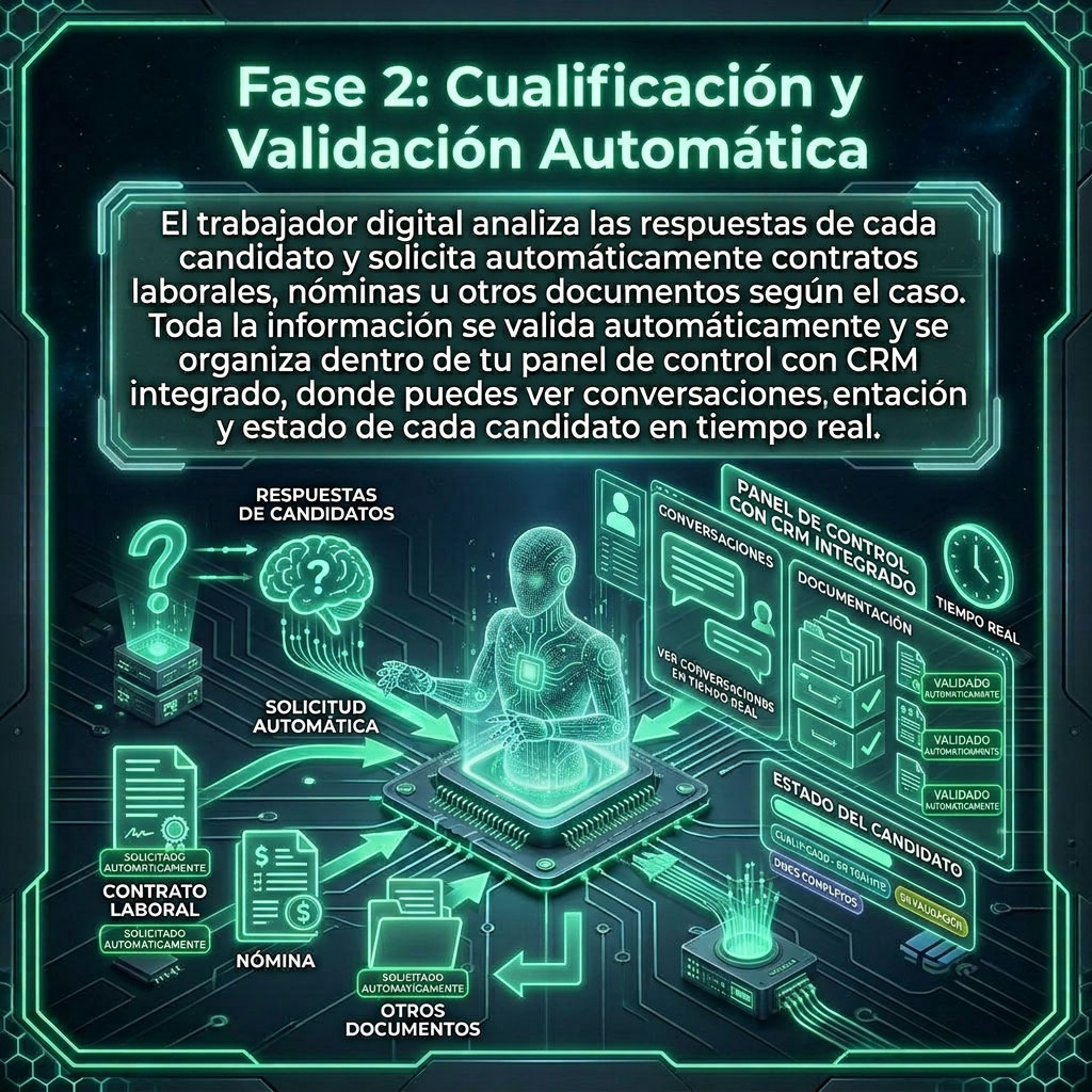 Toda la información se valida automáticamente y se organiza dentro de tu panel de control con CRM integrado, donde puedes ver conversaciones, documentación y estado de cada candidato en tiempo real.