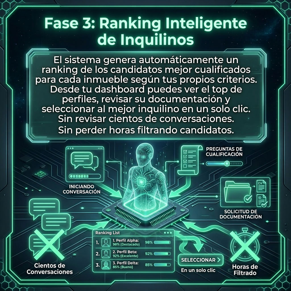 El sistema genera automáticamente un ranking de los candidatos mejor cualificados para cada inmueble según tus propios criterios.